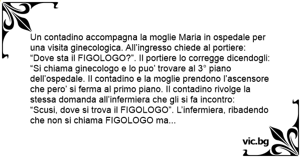 “Scusi, dove si trova il FIGOLOGO”. L’infermiera, ribadendo che non si chiama FIGOLOGO ma bensi’ GINECOLOGO, li indirizza al terzo piano. L’ascensore si ferma ancora al secondo piano; la domanda, rivolta ad un medico che si sta avvicinando, e’ sempre la stessa: