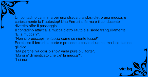Un contadino cammina per una strada tirandosi dietro una mucca, e curiosamente fa l' autostop! Una Ferrari si ferma e il conducente divertito offre il passaggio.