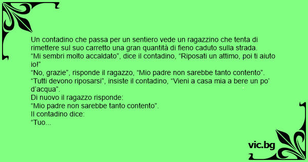 “Mi sembri molto accaldato”, dice il contadino, “Riposati un attimo, poi ti aiuto io!”