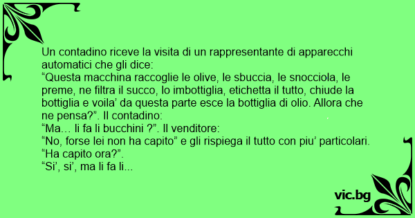 “Questa macchina raccoglie le olive, le sbuccia, le snocciola, le preme, ne filtra il succo, lo imbottiglia, etichetta il tutto, chiude la bottiglia e voila’ da questa parte esce la bottiglia di olio. Allora che ne pensa?”. Il contadino: