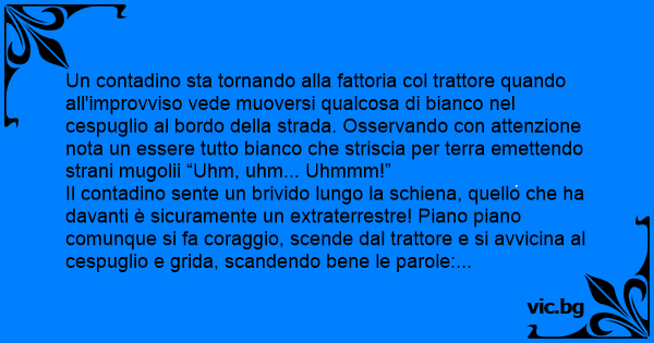Il contadino sente un brivido lungo la schiena, quello che ha davanti è sicuramente un extraterrestre! Piano piano comunque si fa coraggio, scende dal trattore e si avvicina al cespuglio e grida, scandendo bene le parole: