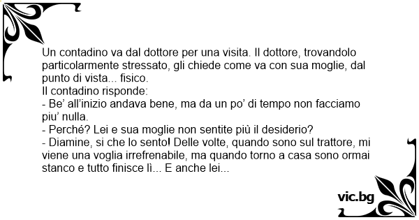 Un contadino va dal dottore per una visita. Il dottore, trovandolo particolarmente stressato, gli chiede come va соn sua moglie, dal punto di vista... fisico.