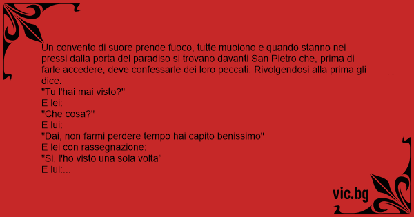Delle suore, finite tutte in paradiso a causa di un incidente stradale con l'autobus, si trovano davanti a un santo. Lui le mette in fila indiana e chiede alla prima: "Che peccati ha fatto?" Lei...