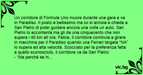 Un corridore di Formula Uno muore durante una gara e va in Paradiso. Il posto è bellissimo ma lui si annoia e chiede a San Pietro di poter guidare ancora una volta un auto. San Pietro lo accontenta ma gli da una cinquecento che non supera i 40 km all`ora. Felice, il corridore comincia a girare in macchina per il Paradiso quando una Ferrari targata “NA” lo supera ad alta velocità. Scocciato per la preferenza fatta a quello sconosciuto, il corridore va da San Pietro: