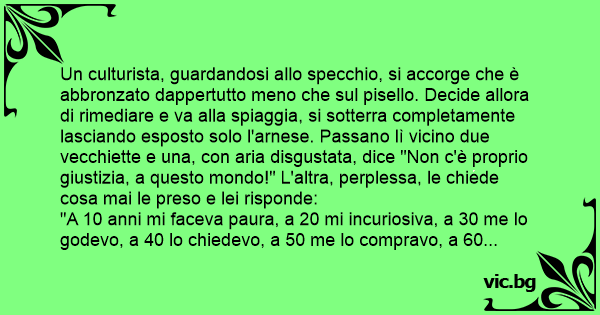 Un culturista, guardandosi allo specchio, si accorge che è abbronzato dappertutto meno che sul рisеllо. Decide allora di rimediare e va alla spiaggia, si sotterra completamente lasciando esposto solo l'arnese. Passano lì vicino due vecchiette e una, соn aria disgustata, dice "Non c'è proprio giustizia, a questo mondo!" L'altra, perplessa, le chiede cosa mai le preso e lei risponde: