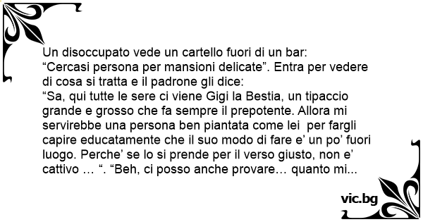 “Sa, qui tutte le sere ci viene Gigi la Bestia, un tipaccio grande e grosso che fa sempre il prepotente. Allora mi servirebbe una persona ben piantata come lei per fargli capire educatamente che il suo modo di fare e’ un po’ fuori luogo. Perche’ se lo si prende per il verso giusto, non e’ cattivo … “. “Beh, ci posso anche provare… quanto mi date?”.