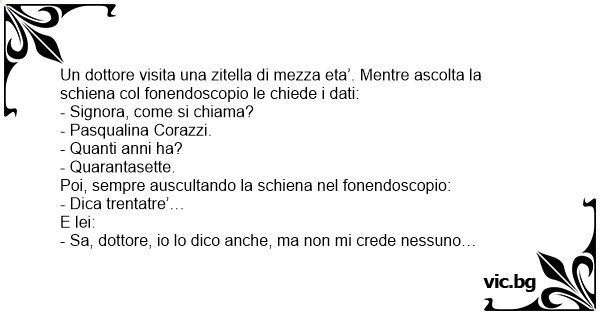 Un dottore visita una zitella di mezza eta’. Mentre ascolta la schiena col fonendoscopio le chiede i dati: