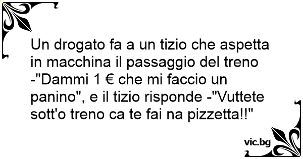 Un drogato fa a un tizio che aspetta in macchina il passaggio del treno -"Dammi 1 € che mi faccio un panino", e il tizio risponde -"Vuttete sott'o treno ca te fai na pizzetta!!"