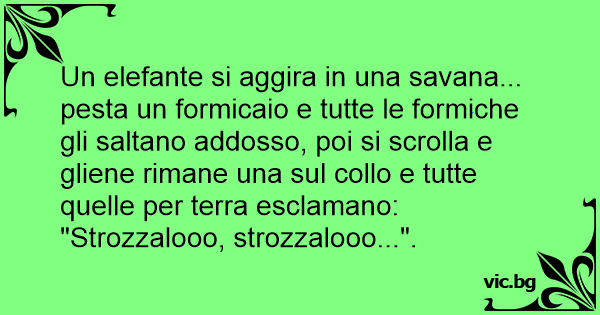 Un elefante si aggira in una savana... pesta un formicaio e tutte le formiche gli saltano addosso, poi si scrolla e gliene rimane una sul collo e tutte quelle per terra esclamano: