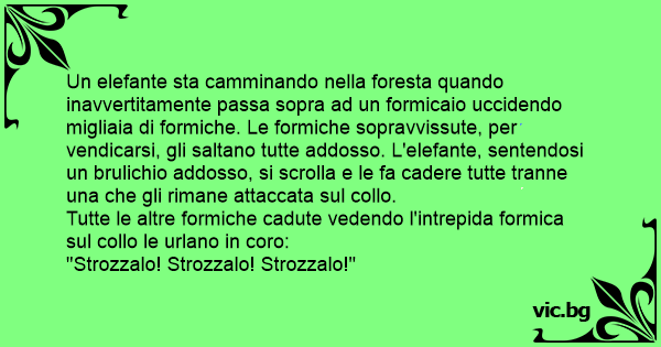 Un elefante sta camminando nella foresta quando inavvertitamente passa sopra ad un formicaio uccidendo migliaia di formiche. Le formiche sopravvissute, per vendicarsi, gli saltano tutte addosso. L'elefante, sentendosi un brulichio addosso, si scrolla e le fa cadere tutte tranne una che gli rimane attaccata sul collo.