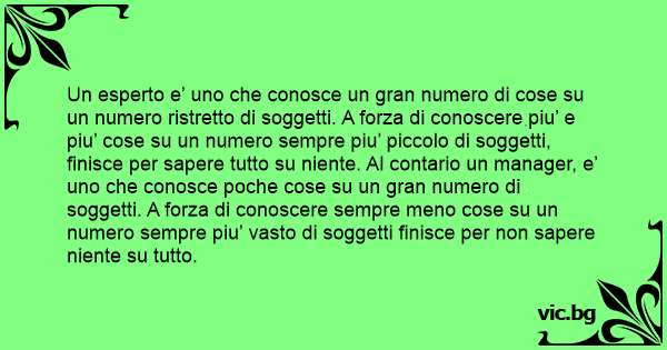 Un esperto e’ uno che conosce un gran numero di cose su un numero ristretto di soggetti. A forza di conoscere piu’ e piu’ cose su un numero sempre piu’ piccolo di soggetti, finisce per sapere tutto su niente. Al contario un manager, e’ uno che conosce poche cose su un gran numero di soggetti. A forza di conoscere sempre meno cose su un numero sempre piu’ vasto di soggetti finisce per non sapere niente su tutto.