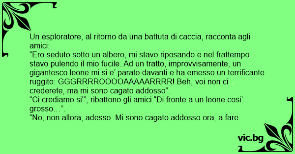 “Ero seduto sotto un albero, mi stavo riposando e nel frattempo stavo pulendo il mio fucile. Ad un tratto, improvvisamente, un gigantesco leone mi si e’ parato davanti e ha emesso un terrificante ruggito: GGGRRRROOOOAAAAARRRR! Beh, voi non ci crederete, ma mi sono cagato addosso”.