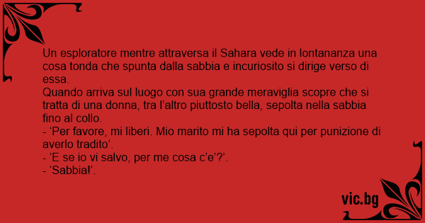 Un esploratore mentre attraversa il Sahara vede in lontananza una cosa tonda che spunta dalla sabbia e incuriosito si dirige verso di essa.