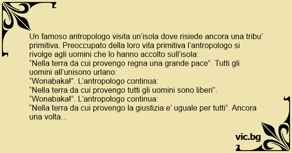 Un famoso antropologo visita un’isola dove risiede ancora una tribu’ primitiva. Preoccupato della loro vita primitiva l’antropologo si rivolge agli uomini che lo hanno accolto sull’isola: