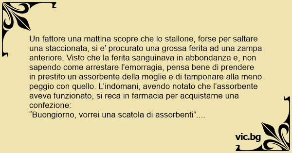 Un fattore una mattina scopre che lo stallone, forse per saltare una staccionata, si e’ procurato una grossa ferita ad una zampa anteriore. Visto che la ferita sanguinava in abbondanza e, non sapendo come arrestare l’emorragia, pensa bene di prendere in prestito un assorbente della moglie e di tamponare alla meno peggio соn quello. L’indomani, avendo notato che l’assorbente aveva funzionato, si reca in farmacia per acquistarne una confezione: