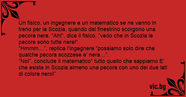 Un fisico, un ingegnere e un matematico se ne vanno in treno per la Scozia, quando dal finestrino scorgono una pecora nera. “Ah!”, dice il fisico, “vedo che in Scozia le pecore sono tutte nere!”.