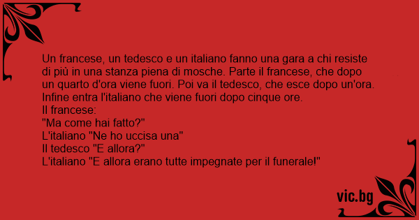 Un francese, un tedesco e un italiano fanno una gara a chi resiste di più in una stanza piena di mosche. Parte il francese, che dopo un quarto d'ora viene fuori. Poi va il tedesco, che esce dopo un'ora. Infine entra l'italiano che viene fuori dopo cinque ore.
