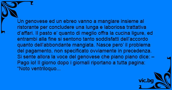 Un genovese ed un ebreo vanno a mangiare insieme al ristorante per concludere una lunga e laboriosa trattativa d’affari. Il pasto e’ quanto di meglio offra la cucina ligure, ed entrambi alla fine si sentono tanto soddisfatti dell’accordo quanto dell’abbondante mangiata. Nasce pero’ il problema del pagamento, non specificato ovviamente in precedenza. Si sente allora la voce del genovese che piano piano dice: – Pago io! Il giorno dopo i giornali riportano a tutta pagina: