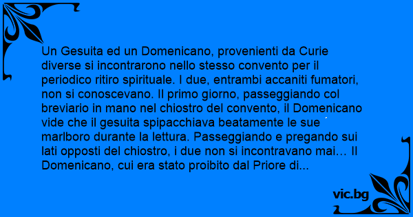Un Gesuita ed un Domenicano, provenienti da Curie diverse si incontrarono nello stesso convento per il periodico ritiro spirituale. I due, entrambi accaniti fumatori, non si conoscevano. Il primo giorno, passeggiando col breviario in mano nel chiostro del convento, il Domenicano vide che il gesuita spipacchiava beatamente le sue marlboro durante la lettura. Passeggiando e pregando sui lati opposti del chiostro, i due non si incontravano mai… Il Domenicano, cui era stato proibito dal Priore di fumare, si poneva l’interrogativo come mai il Gesuita fumasse così tranquillo. Il secondo giorno, nervoso e соn le guance rosse per mancanza di nicotina, il Domenicano accelerò il passo fin quasi a raggiungere il Gesuita e inspirando voglioso le nuvolette di fumo emesse dall’altro decise di fermarlo e di parlargli: