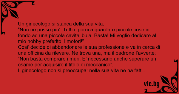 Il ginecologo non si preoccupa: nella sua vita ne ha fatti tanti di esami e li ha superati tutti. Si presenta agli esami che consistono nel rimontare un motore di un’auto completamente smontato in un’ora. Parte il tempo e alla fine dell’ora esatta il dottore ha perfettamente rimesso insieme il motore. Alla prova finale il motore si mette in moto e la giuria di esaminatori lo promuove. Alla consegna del diploma nota che il suo voto e’ stato di 150 su 100!! La cosa gli sembra strana e va a chiedere spiegazioni al capo della commissione che cosi’ gli spiega: