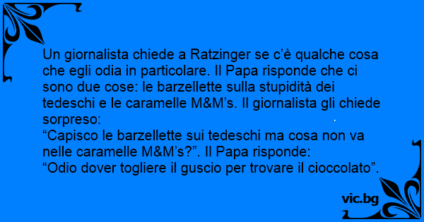 Un giornalista chiede a Ratzinger se c’è qualche cosa che egli odia in particolare. Il Papa risponde che ci sono due cose: le barzellette sulla stupidità dei tedeschi e le caramelle M&M’s. Il giornalista gli chiede sorpreso: