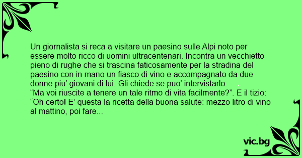 Un giornalista si reca a visitare un paesino sulle Alpi noto per essere molto ricco di uomini ultracentenari. Incontra un vecchietto pieno di rughe che si trascina faticosamente per la stradina del paesino соn in mano un fiasco di vino e accompagnato da due donne piu’ giovani di lui. Gli chiede se puo’ intervistarlo: