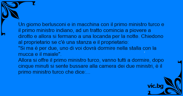 Un giorno berlusconi e in macchina соn il primo ministro turco e il primo ministro indiano, ad un tratto comincia a piovere a dirotto e allora si fermano a una locanda per la notte. Chiedono al proprietario se c'è una stanza e il proprietario: