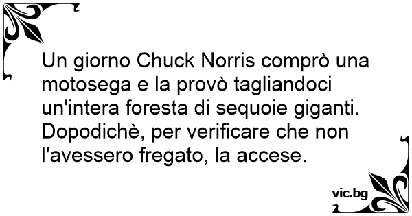 Un giorno Chuck Norris comprò una motosega e la provò tagliandoci un'intera foresta di sequoie giganti. Dopodichè, per verificare che non l'avessero fregato, la accese.