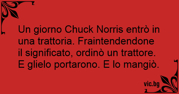 Un giorno Chuck Norris entrò in una trattoria. Fraintendendone il significato, ordinò un trattore. E glielo portarono. E lo mangiò.