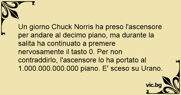 Un giorno Chuck Norris ha preso l'ascensore per andare al decimo piano, ma durante la salita ha continuato a premere nervosamente il tasto 0. Per non contraddirlo, l'ascensore lo ha portato al 1.000.000.000.000 piano. E' sceso su Urano.