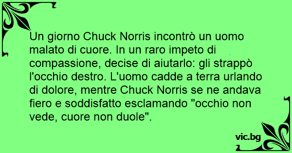 Un giorno Chuck Norris incontrò un uomo malato di cuore. In un raro impeto di compassione, decise di aiutarlo: gli strappò l'occhio destro. L'uomo cadde a terra urlando di dolore, mentre Chuck Norris se ne andava fiero e soddisfatto esclamando "occhio non vede, cuore non duole".