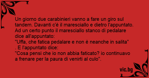 Un giorno due carabinieri vanno a fare un giro sul tandem. Davanti c'è il maresciallo e dietro l'appuntato. Ad un certo punto il maresciallo stanco di pedalare dice all'appuntato: