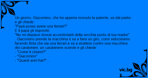 . Giacomino prende la macchina e va a farsi un giro, corre velocissimo facendo finta che sia una ferrari e va a sваттеrе contro una macchina dei carabinieri, un carabiniere scende e gli chiede: