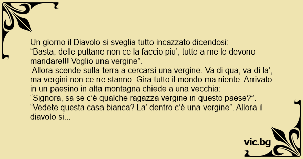 Allora scende sulla terra a cercarsi una vergine. Va di qua, va di la’, ma vergini non ce ne stanno. Gira tutto il mondo ma niente. Arrivato in un paesino in alta montagna chiede a una vecchia: