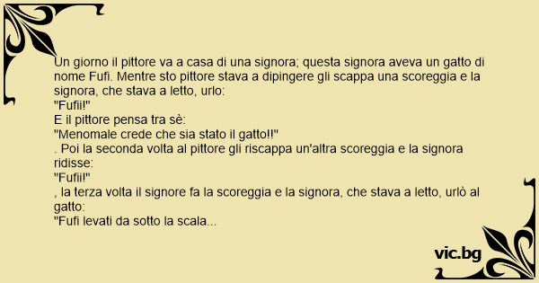 Un giorno il pittore va a casa di una signora; questa signora aveva un gatto di nome Fufi. Mentre sto pittore stava a dipingere gli scappa una sсоrеggiа e la signora, che stava a letto, urlo: