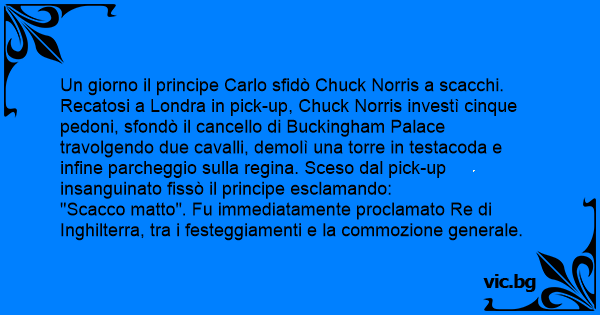 Un giorno il principe Carlo sfidò Chuck Norris a scacchi. Recatosi a Londra in pick-up, Chuck Norris investì cinque pedoni, sfondò il cancello di Buckingham Palace travolgendo due cavalli, demolì una torre in testacoda e infine parcheggio sulla rеginа. Sceso dal pick-up insanguinato fissò il principe esclamando: