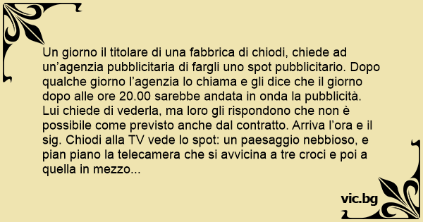 Un giorno il titolare di una fabbrica di chiodi, chiede ad un’agenzia pubblicitaria di fargli uno spot pubblicitario. Dopo qualche giorno l’agenzia lo chiama e gli dice che il giorno dopo alle ore 20.00 sarebbe andata in onda la pubblicità. Lui chiede di vederla, ma loro gli rispondono che non è possibile come previsto anche dal contratto. Arriva l’ora e il sig. Chiodi alla TV vede lo spot: un paesaggio nebbioso, e pian piano la telecamera che si avvicina a tre croci e poi a quella in mezzo dove c’è Cristo. Quindi si vede solo la sua mano e poi solo il chiodo e una voce dice “CHIODI ESPOSITO”. Allora un sacco di persone, sentitesi offese dalla blasfemia si radunano fuori di casa sua e cominciano a protestare. Lui spaventato chiama la agenzia e protesta: