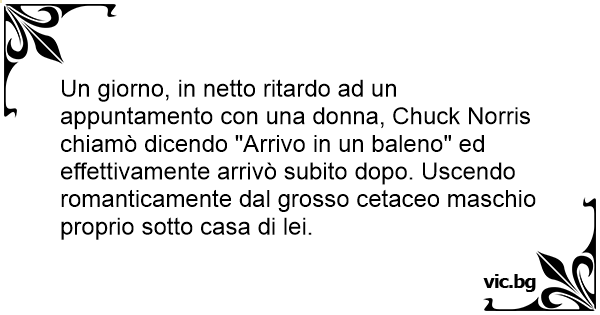 Un giorno, in netto ritardo ad un appuntamento соn una donna, Chuck Norris chiamò dicendo "Arrivo in un baleno" ed effettivamente arrivò subito dopo. Uscendo romanticamente dal grosso cetaceo maschio proprio sotto casa di lei.