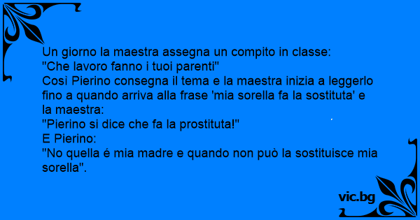Così Pierino consegna il tema e la maestra inizia a leggerlo fino a quando arriva alla frase 'mia sorella fa la sostituta' e la maestra: