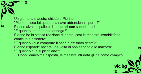 Il giorno dopo Pierino va a scuola cercando di memorizzare le risposte e arrivato in classe la maestre chiede: