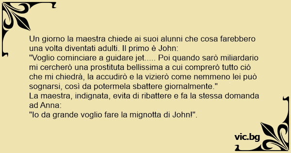 Učitel sa pýtá dětí v triedě: ,,Co chceš byť, až vyrastieš?" - Johnny? ,,Chcem byť miliardar, budem clenom najdrahsich klubov, budem mat najkrajsiu k*rvu, dam jej Ferrari, milion dolarov, byt v...
