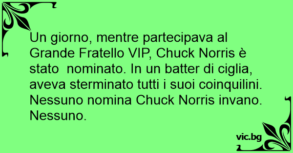 Un giorno, mentre partecipava al Grande Fratello VIP, Chuck Norris è stato nominato. In un batter di ciglia, aveva sterminato tutti i suoi coinquilini. Nessuno nomina Chuck Norris invano. Nessuno.