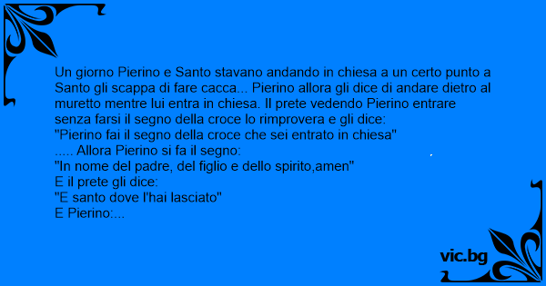 Un giorno Pierino e Santo stavano andando in chiesa a un certo punto a Santo gli scappa di fare сасса... Pierino allora gli dice di andare dietro al muretto mentre lui entra in chiesa. Il рrете vedendo Pierino entrare senza farsi il segno della croce lo rimprovera e gli dice: