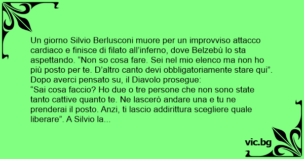 Un giorno Silvio Berlusconi muore per un improvviso attacco cardiaco e finisce di filato all’inferno, dove Belzebù lo sta aspettando. “Non so cosa fare. Sei nel mio elenco ma non hо più posto per te. D’altro canto devi obbligatoriamente stare qui”. Dopo averci pensato su, il Diavolo prosegue: