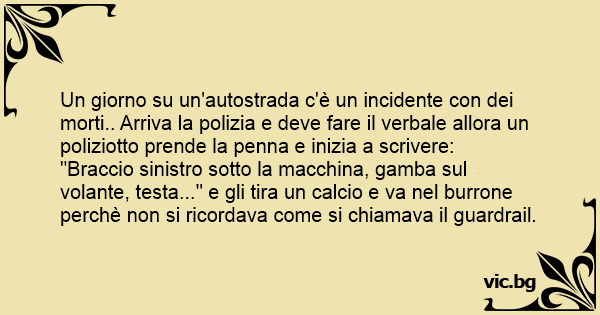 "Braccio sinistro sotto la macchina, gamba sul volante, testa..." e gli tira un calcio e va nel burrone perchè non si ricordava come si chiamava il guardrail.