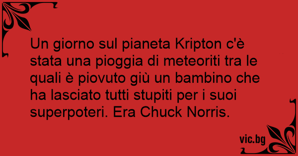 Un giorno sul pianeta Kripton c'è stata una pioggia di meteoriti tra le quali è piovuto giù un bambino che ha lasciato tutti stupiti per i suoi superpoteri. Era Chuck Norris.