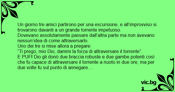 E PUF! Dio gli donò due braccia robuste e due gambe potenti così che fu capace di attraversare il torrente a nuoto in due ore, ma per due volte fu sul punto di annegare.