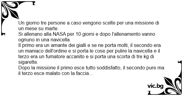 Dopo la missione il primo esce tutto soddisfatto, il secondo pure ma il terzo esce malato соn la faccia bianca come se stesse per morire e соn molta fatica dice: