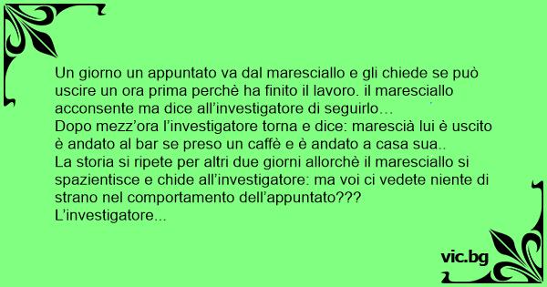 Un giorno un appuntato va dal maresciallo e gli chiede se può uscire un ora prima perchè ha finito il lavoro. il maresciallo acconsente ma dice all’investigatore di seguirlo…