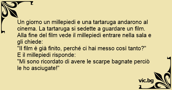 Un giorno un millepiedi e una tartaruga andarono al cinema. La tartaruga si sedette a guardare un film. Alla fine del film vede il millepiedi entrare nella sala e gli chiede: